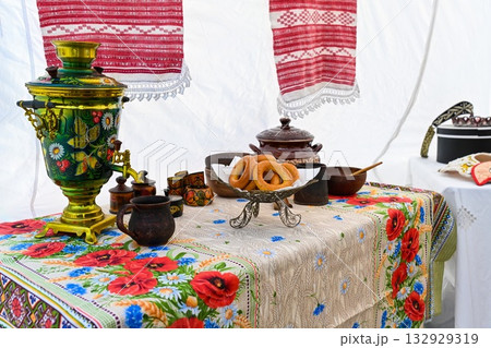 Traditional Slavic tea setting with painted samovar, poppy tablecloth, bagels, and clay dishes. Russian folk culture and colorful patterns.