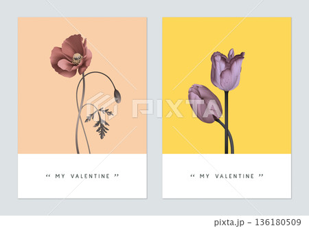 Minimalist botanical valentine greeting card template design, poppy and tulip flowers