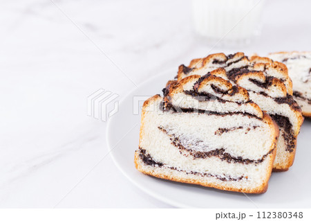 Fresh sweet tasty yeast baked goods with poppy seed filling on white plate at white background. Delicious homemade bun