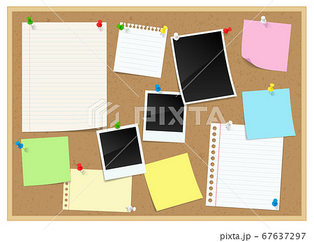 コルクボードに貼られたメモ、付箋、ポラロイド写真