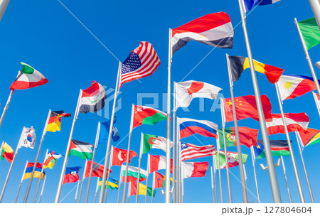 World congress countries national flags waving together on the wind, with American, Japanese, Omani, Chinese, Russian, Iraqi, Egyptian banners in the foreground, Doha, Qatar