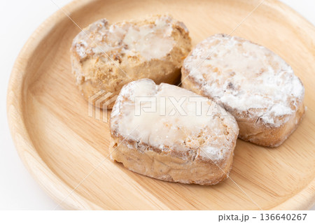 白背景に木のお皿に載せたポルボロン(ポルボローネ)