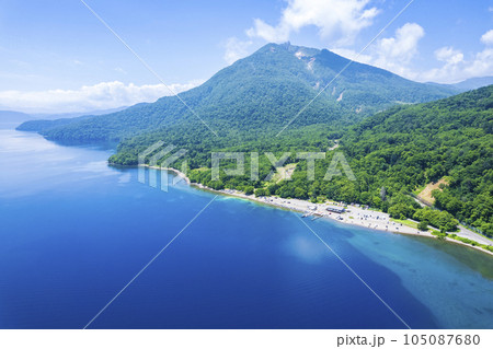 夏の支笏湖を空撮(ポロピナイ 支笏湖ブルー)