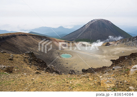 日本百名山 雌阿寒岳山頂から望む ポンマチネシリ火口 青沼と阿寒富士
