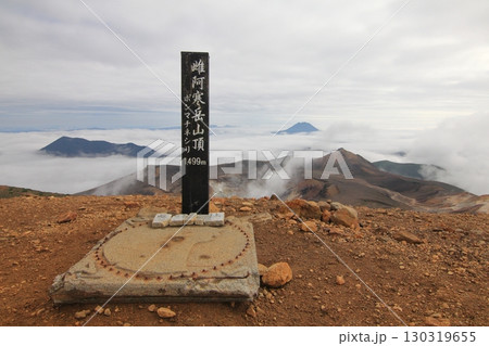 日本百名山 雌阿寒岳山頂から望む 山頂標識と中マチネシリ火口 雄阿寒岳方面の雲海
