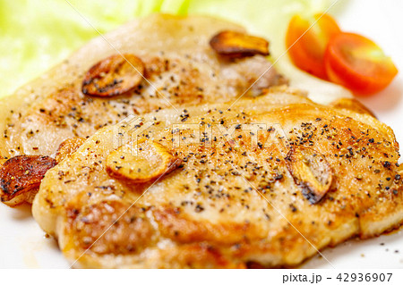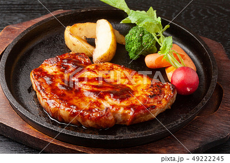 厚切りポークステーキ、トンテキ。豚肉のステーキ。生姜焼き。洋食イメージ。