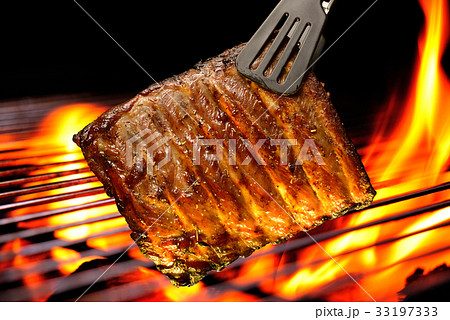 Grilled pork ribs on the flaming grill