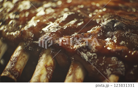 Grilled barbecue ribs with caramelized sauce macro view, close-up
