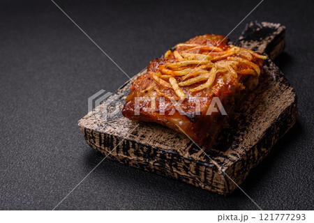 Delicious dried smoked beef or horse meat jerky with spices and salt