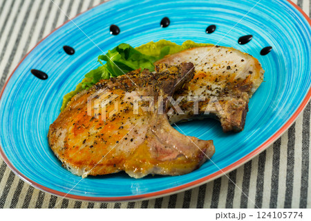 Roast BBQ pork chop steak on plate with potato chips. Isolated on white background.