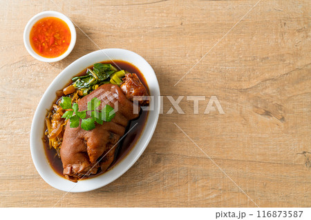 boiled chop pork with liver Thai salad taste spicy and sour on plate eat couple sticky rice and fresh vegetable