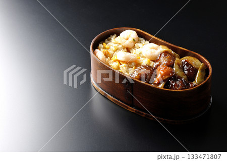 海老炒飯黒酢酢豚弁当を黒背景で撮影