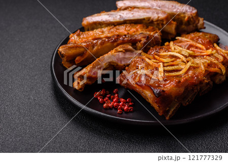 Pork or beef ribs with salt, spices and herbs baked on the grill