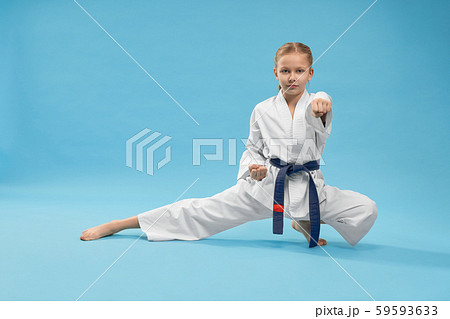 Karate girl standing in stance and training punching.