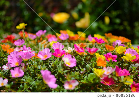 夏のガーデニングのの主役 きれいに咲いた満開のカラフルポーチュラカ
