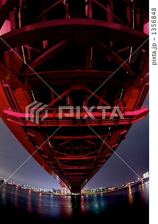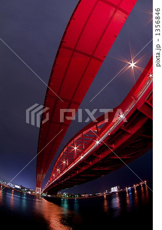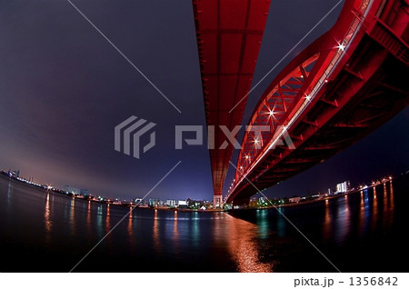 夜空に輝く神戸大橋と街灯の光芒(横/魚眼構図分割点)