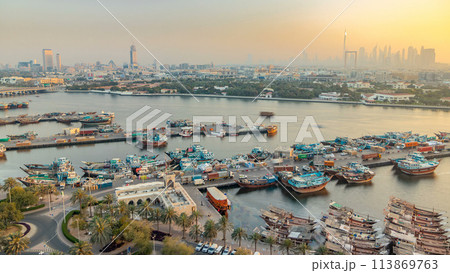 Dubai creek landscape timelapse with boats and ship in port and modern buildings in the background during sunset
