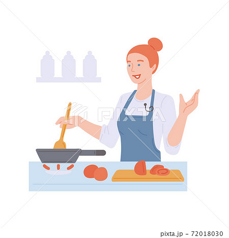 Woman cooking food in kitchen - cartoon cook in apron stirring ingredients