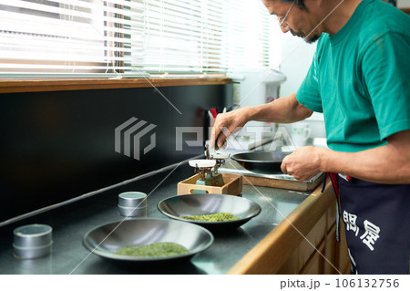 検査室で日本茶の計量をする茶師