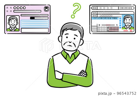 マイナンバーカードと運転免許証の一体化について考えているシニア男性のイラスト