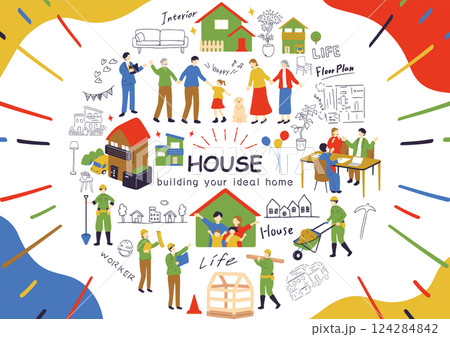 家の購入や設計について楽しそうに会話する家族のセット コミカルな手書きの人物
