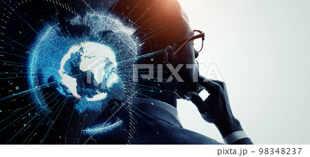 瞑想する黒人男性とグローバルネットワーク バナー・広告向けビジュアル