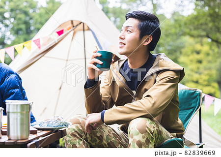 キャンプ コーヒーを飲む男性