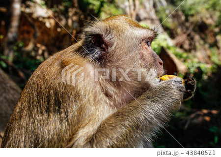 Macaque monkey sitting on the ground. Monkey Island, Vietnam