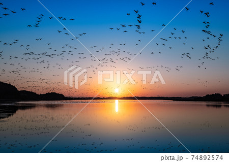 朝焼け宮城伊豆沼から渡り鳥達の朝の飛び立ち