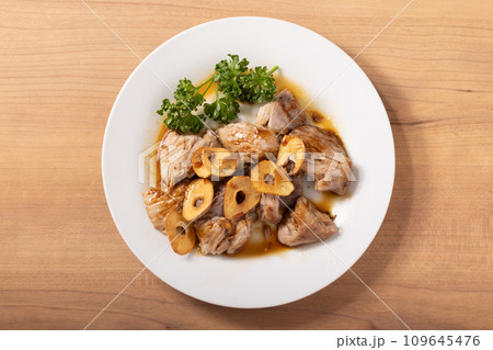 お皿に乗せたマグロの頬肉の照焼きステーキ【白背景・切り抜き】