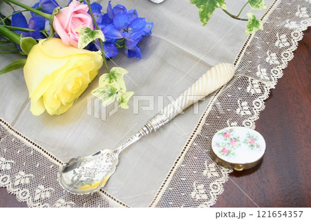 アンティークのレースの上に置かれたマザーオブパールのジャムスプーン