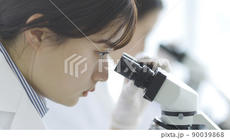 顕微鏡を覗く白衣の女性 研究 実験