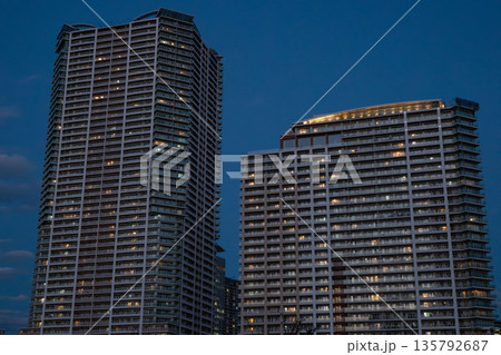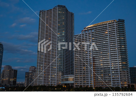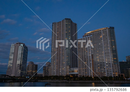 夕暮れ時の2020年の豊洲のマンション群、越中島からの夕暮れの豊洲