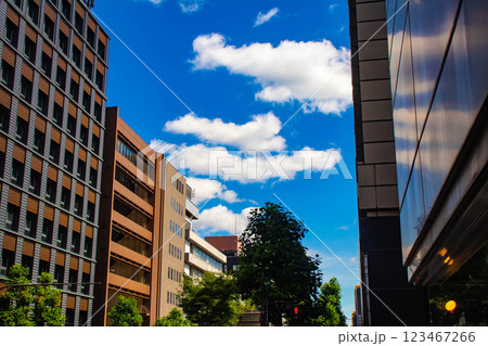 オフィスビルの窓ガラスに反射する雲【都市イメージ】