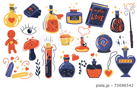 Love potion. Doodle magical elixir. Bottles with alchemical beverages. Witchcraft tools and mystical symbols. Spell book or fortune-telling cards. Drink to awaken senses, vector set