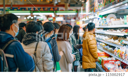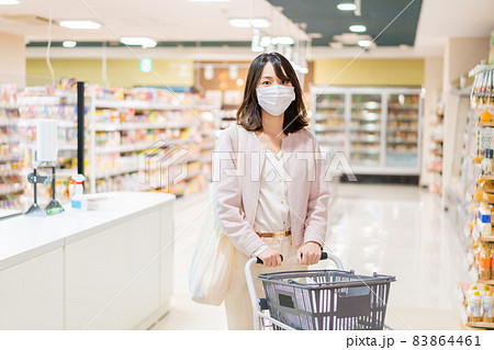 スーパーで買い物をするマスク姿の若い女性