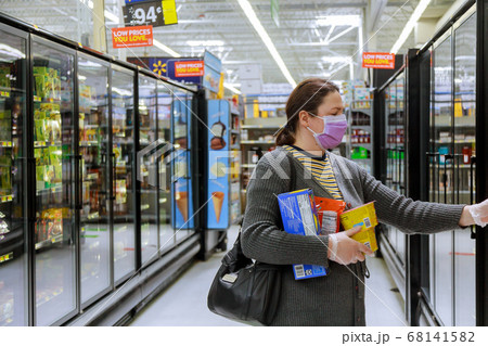マスクをしてスーパーで買い物をする主婦