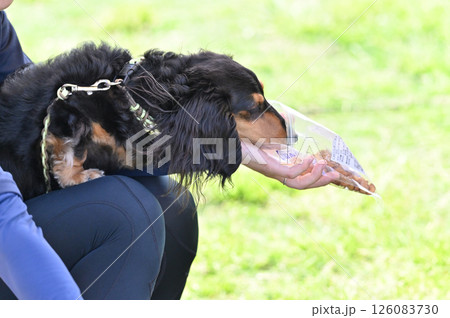 おやつをクンクン 鼻を突っ込む ダックス(カニンヘンダックス)