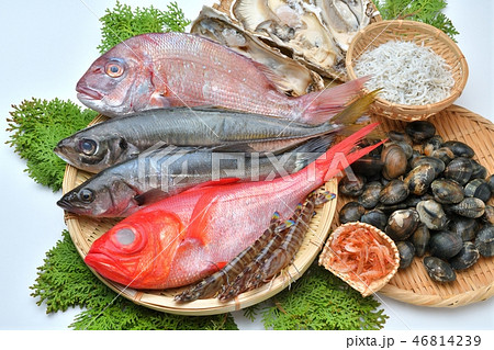 注意)背景に小ゴミあり。魚介類(金目鯛、真鯛、鯵、セイゴ、牡蛎、アサリ、車海老、シラス、桜海老)