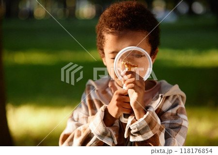 African American boy using magnifier to examine chanterelle while gathering mushroom in wood