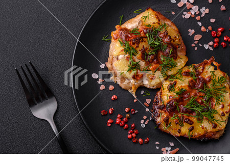 Meat baked in the oven with pineapple, tomatoes, cheese, spices and herbs