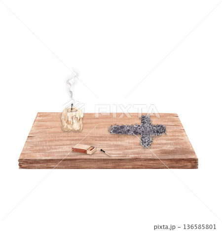 Watercolor illustration of ash cross on wooden table with burning candle and matchbox, Christian symbol of Ash Wednesday and Lent, hand painted religious composition isolated on light background