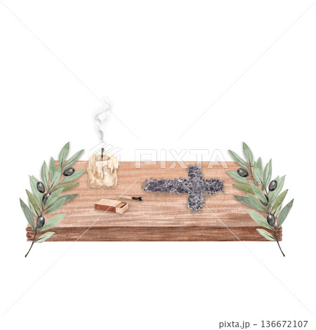 Ash cross on wooden table with burning candle, matchbox, olive branches Watercolor illustration isolated on white background. Symbol of Ash Wednesday and Lent, hand painted religious composition