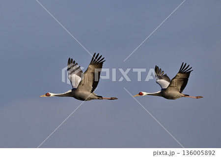 飛翔するマナヅルのつがい(鹿児島県・出水市)