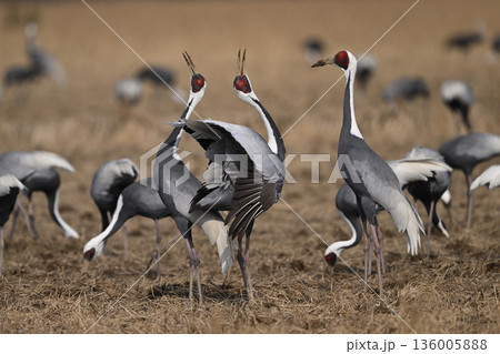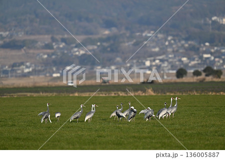 冬の田んぼに集まるツルの群れ 日本の野鳥風景