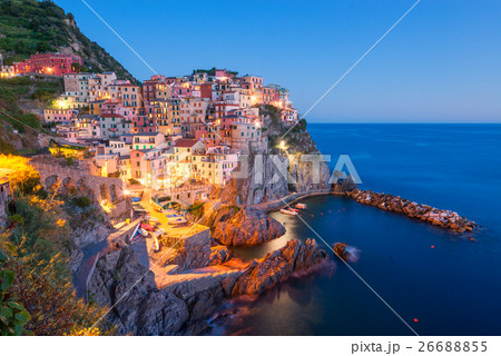 イタリア チンクエテッレ マナローラの町並みの夜景