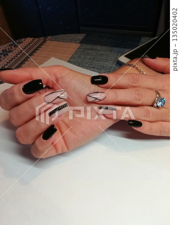 Manicured Hands Display. Hands showcasing manicured nails with black and nude polish, geometric patterns, rhinestones and glossy finish over white surface.