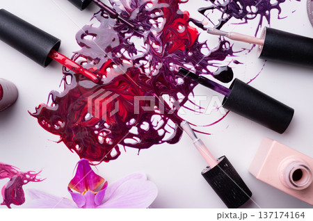 beautiful colorful abstract nail gel polish texture with applicators and orchid on white background
