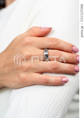 Close-up of female hand with silver ring resting on white fabric background