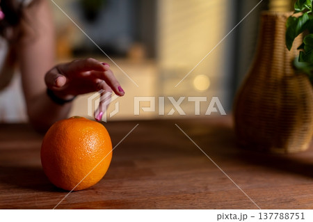 Closeup orange being touched by hand, textural peel emphasized, dim ambient kitchen light, nail polish detail, minimalist table styling, sensory still life composition